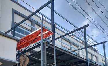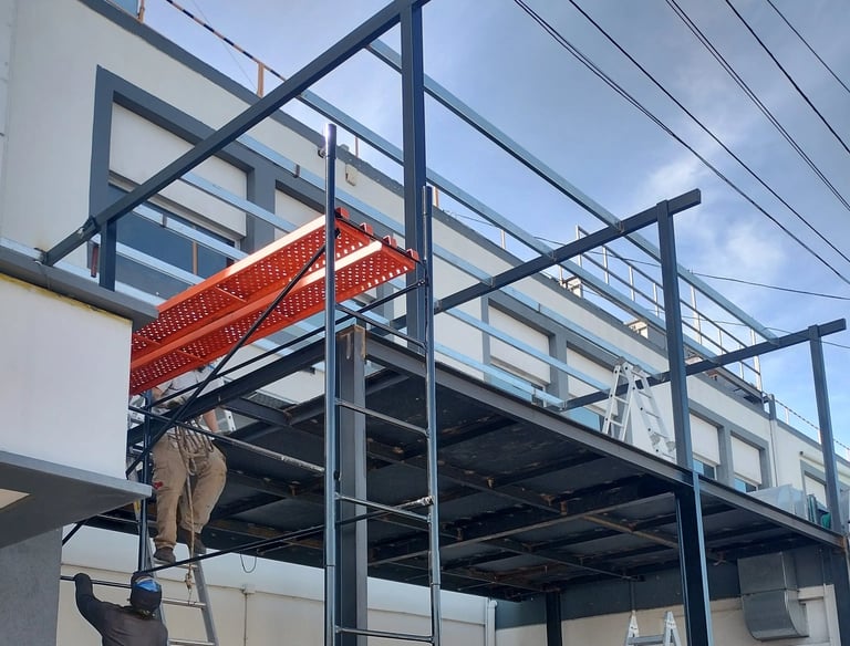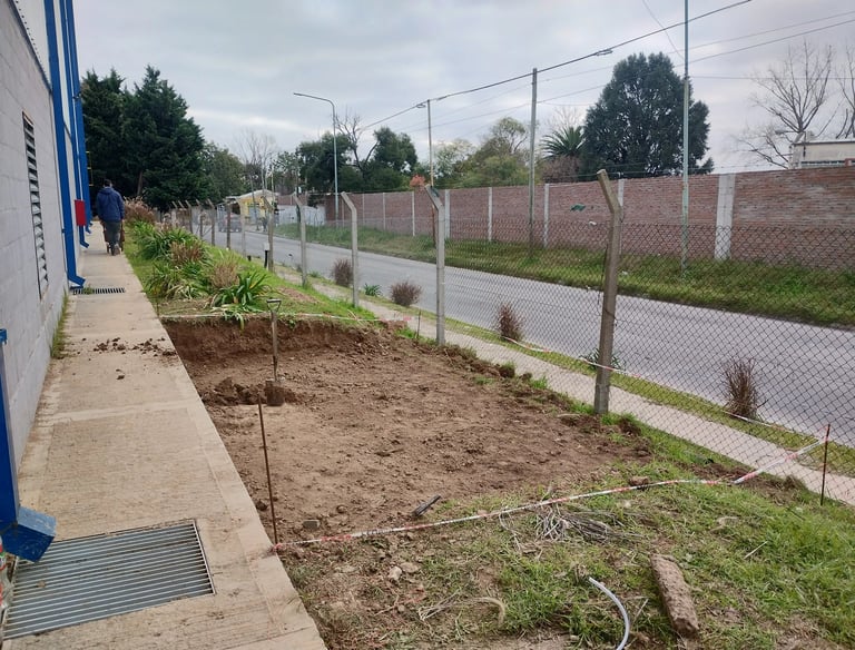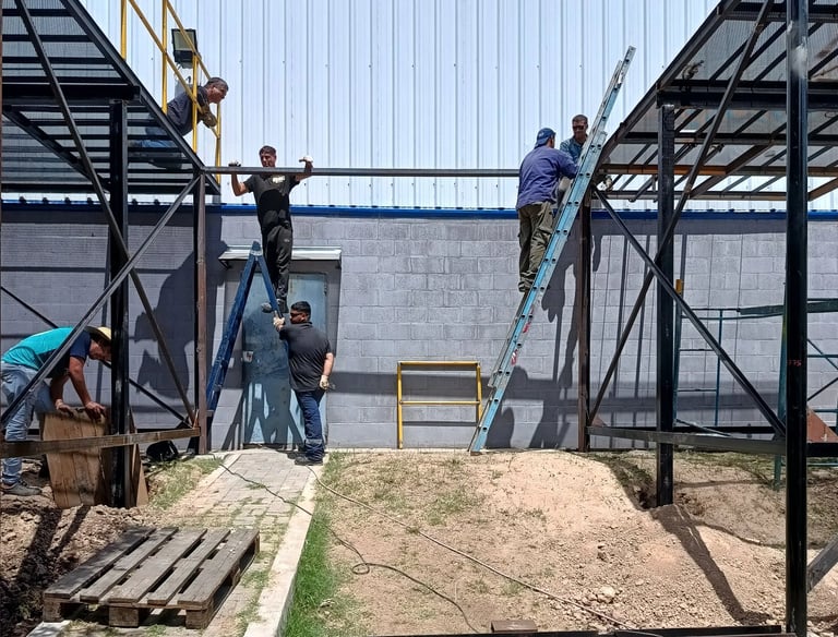 El proyecto abarcó la obra civil (levantamiento de vereda, socavación y compactación del terreno, encadenado y hormigonado) y la estructura metálica con sus cálculos y montaje.