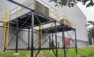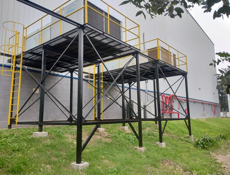 Diseño, cálculo y montaje de tres plataformas estructurales metálicas en altura. El objetivo fue soportar equipos de refrigeración de alta capacidad para la climatización controlada de una nave de almacenamiento de materia prima farmacéutica, asegurando estabilidad y cumplimiento.